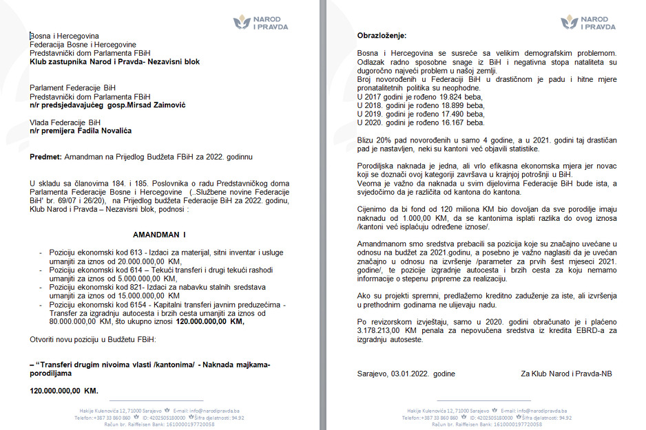Nakon što je Prijedlog budžeta Federacije BiH u parlamentarnu proceduru upućen i zastupnicima u Parlamentu FBiH dostavljen posljednjeg dana 2021. godine u popodnevnim satima, iz Naroda i pravde su najavili podnošenje amandmana kojim bi se osiguralo 120 miliona KM podrške za porodilje u cijeloj Federaciji BiH.
