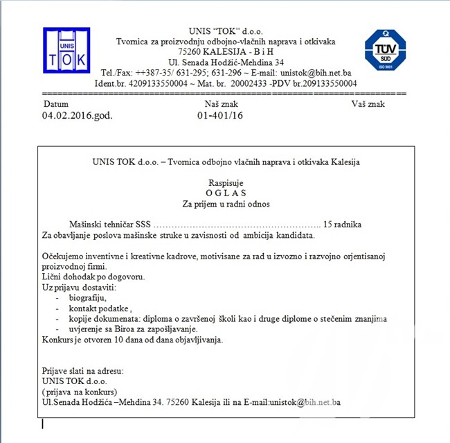 Kalesijska firma Unis Tok raspisala je konkurs za prijem 15 novih radnika za rad u ovoj profitabilnoj firmi koja iz godine u godinu bilježi sve bolje rezultate us vome radu.