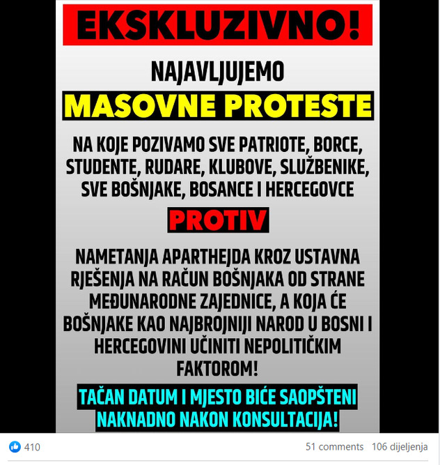 “Obavještavamo javnost da se na internetu pojavio anonimni pamflet kojim se pozivaju ‘svi patrioti, borci, studenti, rudari, klubovi, službenici, svi Bošnjaci, Bosanci i Hercegovci’ na proteste protiv ‘nametanja aparthejda kroz ustavna rješenja na račun Bošnjaka’ Na pamfletu se nalazi i ime Reisul-uleme Husein-ef. Kavazovića, što je gruba zloupotreba imena najvišeg duhovnog autoriteta Bošnjaka”, navodi se u saopćenju Rijaseta.