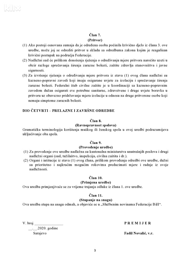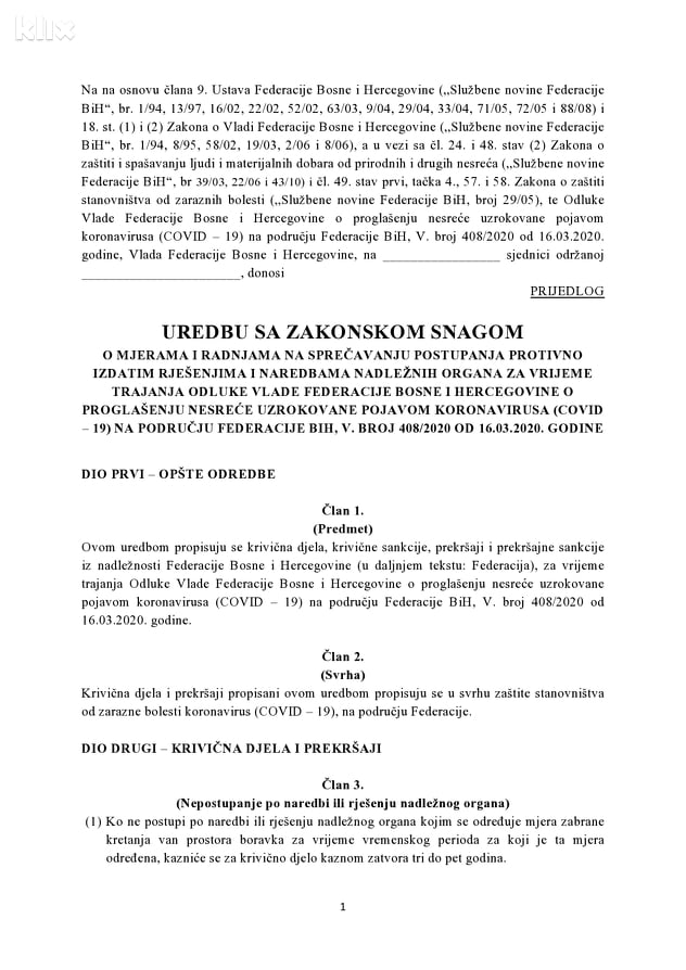 Federalni ministar unutrašnjih poslova Aljoša Čampara predložio je Vladi Federacije Bosne i Hercegovine da hitno usvoji “Uredbu – sa zakonskom snagom – o mjerama i radnjama na sprečavanju postupanja protivno izdatim rješenjima i naredbama nadležnih organa za vrijeme trajanja Odluke Vlade Federacije BiH o proglašenju nesreće uzrokovane pojavom koronavirusa (COVID-19) na području Federacije BiH”.