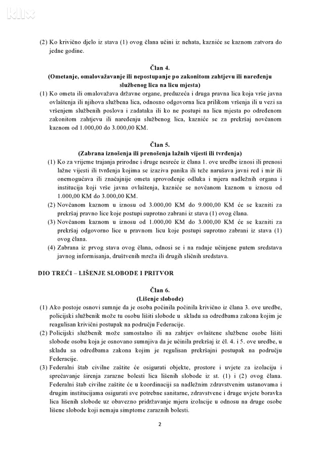 Predloženom Uredbom je propisano da će nepostupanje po naredbi ili rješenju nadležnog organa kojim se određuje mjera zabrane kretanja biti tretirano kao krivično djelo koje će se kažnjavati kaznom zatvora od tri do pet godina, a ko ovo krivično djelo učini iz nehata kažnjavat će se kaznom zatvora do jedne godine. Osobe koje budu ometale, omalovažavale ili nepostupale po zakonitom zahtjevu ili naređenju službenog lica na licu mjesta kaznit će se za prekršaj novčanom kaznom od 1.000 KM do 3.000 KM.