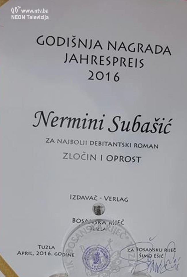 Na sajmu knjige u Sarajevu, nagrada za najbolji debitantski roman u 2016.godini pod nazivom “Zločin i oprost” otišla je u ruke Nermine Subašić iz Vukovija. Nermina Subašić je rođena 1998.godine, a završila je osnovno obrazovanje u Gornjim Vukovijama kao učenik generacije, a školovanje je nastavila u Sarajevu u zubotehničkoj školi gdje također odlična učenica.