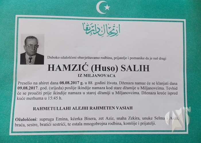Dženaza-namaz Salihu Hamziću će se klanjati sutra (srijeda) 09.08.2017. godine poslije ikindije-namaza kod stare džamije u Miljanovcima.