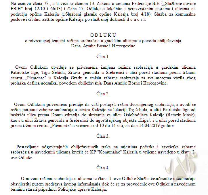 Povodom Dana Armije RBiH Služba za komunalne poslove i civilnu zaštitu općine Kalesija po službenoj dužnosti donijela je odluku o privremenoj izmjeni režima saobraćaja u gradskim ulicama za nedjelju, 14. april 2019. godine.
