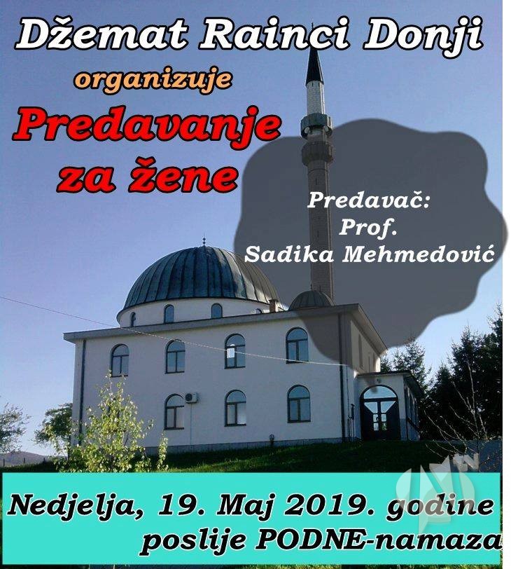 U skoro svim džematima u Bosni i Hercegovini pa tako i na području MIZ Kalesija u toku mubarek mjeseca ramazana organizuju se predavanja za žene. Tako će, u okviru ramazanskih aktivnosti, u nedjelju biti upriličeno predavanje za žene u džematu Rainci Donji. Predavanje će se održatinakon poden namaza a predavač je profesorica Sadika Mehmedović.